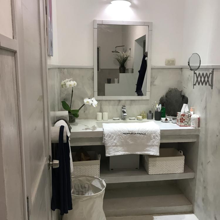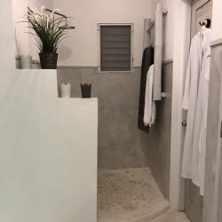 * 1 salle de douche en béton ciré avec WC fermé au niveau de la piscine